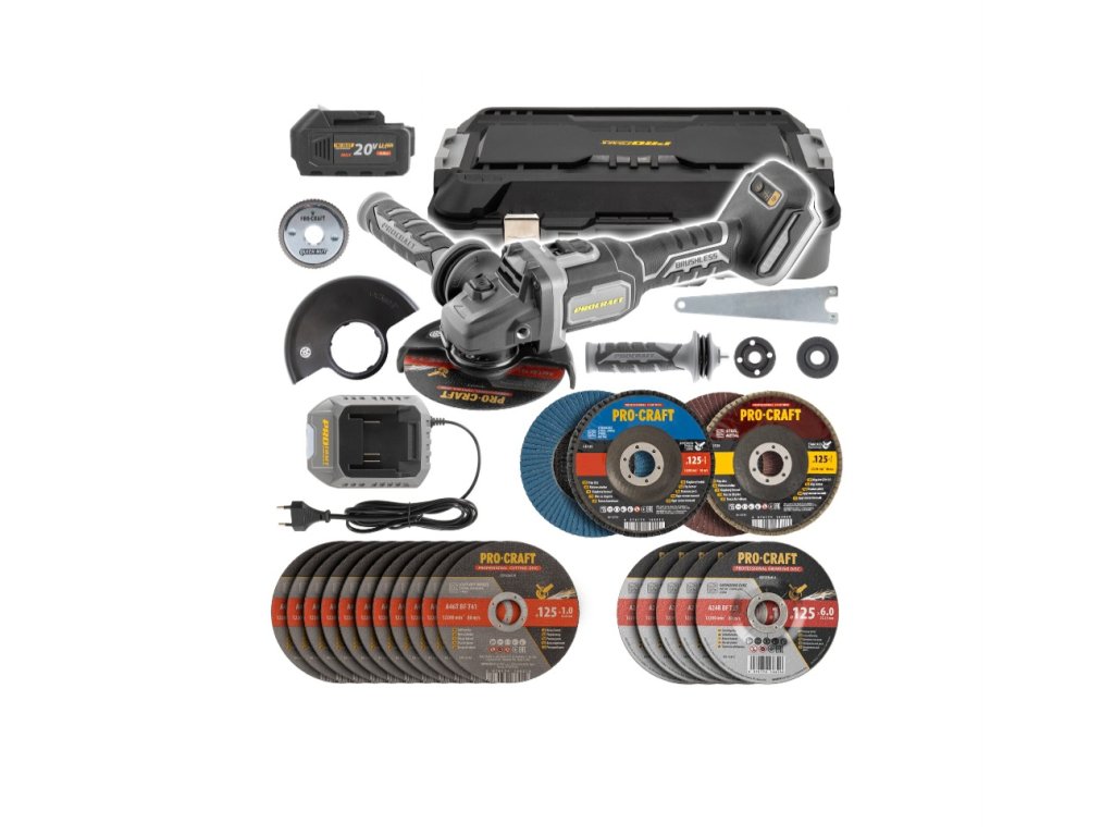 Aku bruska úhlová Procraft AG125B + 10x řezný, 4x lamelový, 5x brusný kotouče, rychloupínací matice