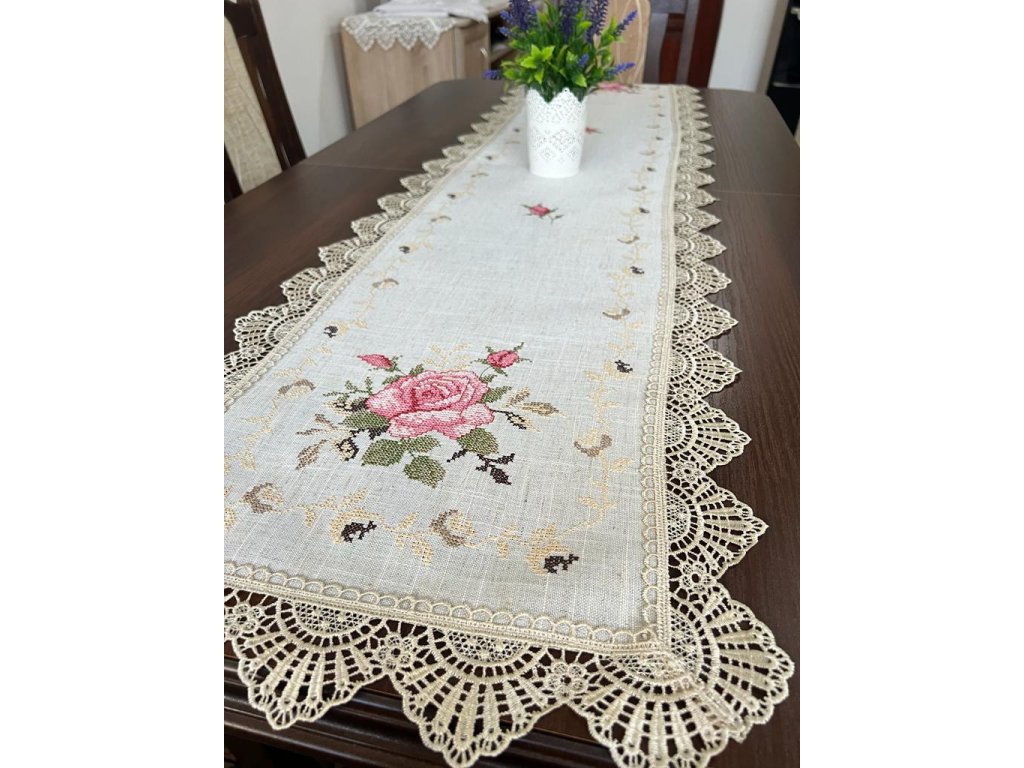 Dekoráčny obrus behúň na stôl vyšívaný s ružovou ružou, krémova hneda s krajkou.
