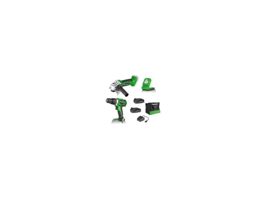 S výkonnou akumulátorovou vrtačkou / šroubovákem, úhlovou bruskou a praktickou LED svítilnou pro všechny práce kolem domu, dílny a garáže.