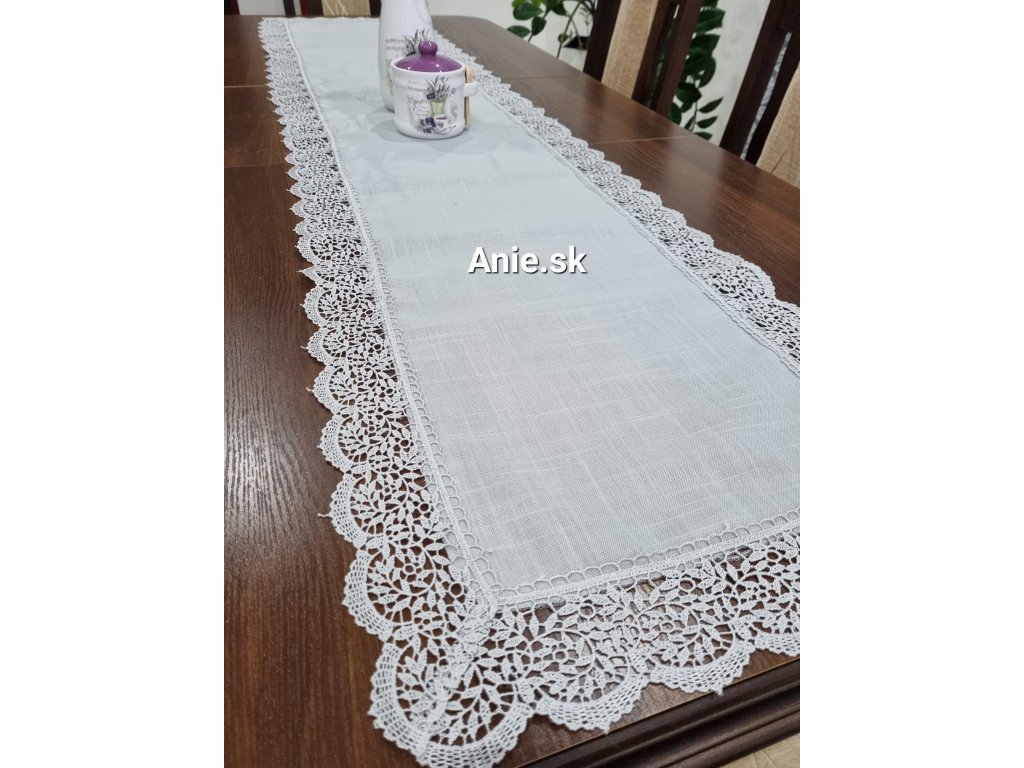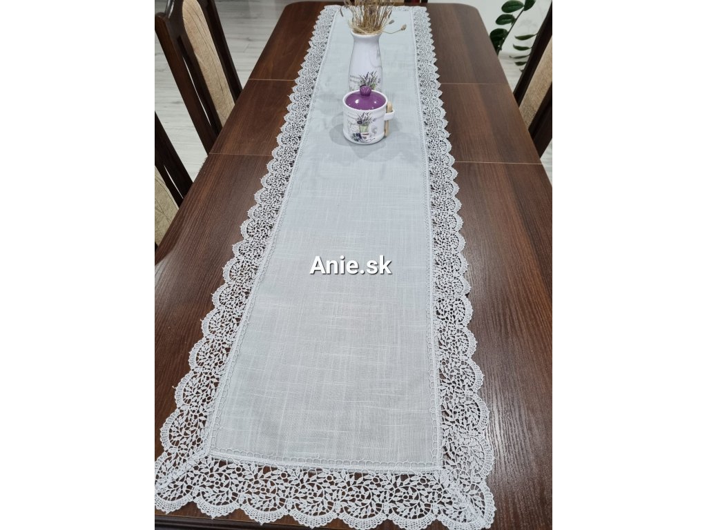 Dekorativní ubrus běhoun v šedém s krajkou.