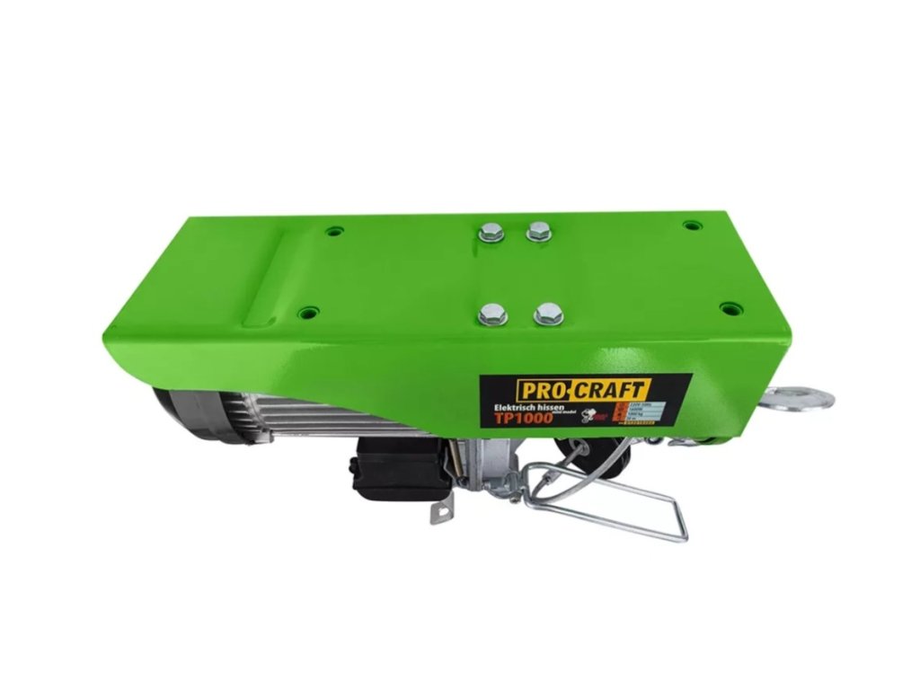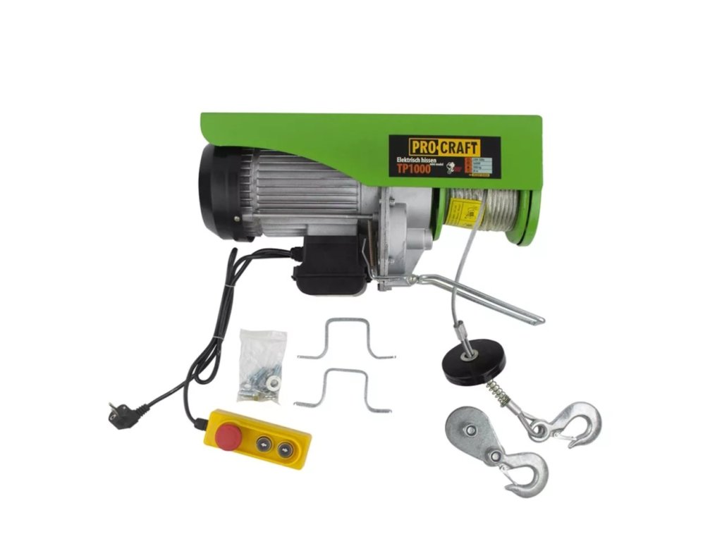 Elektrický lanový navijak Procraft TP1000 je určený na spúšťanie alebo zdvíhanie pevných bremien. Vysokú nosnosť až do 1000kg umožňuje silný indukčný motor s výkonom 1600W. Bez kladky umožňuje zdvíhanie až 500kg na výšku až 20m. Možnosť použitia s jednoduchým alebo dvojitým závesom pomocou kladky. Kvalitné oceľové lano a spoľahlivý motor zaručuje dlhú bezporuchovú prácu. Súčasťou dodávky sú 2 úchytky, oceľové lano. Balenie kartón.
