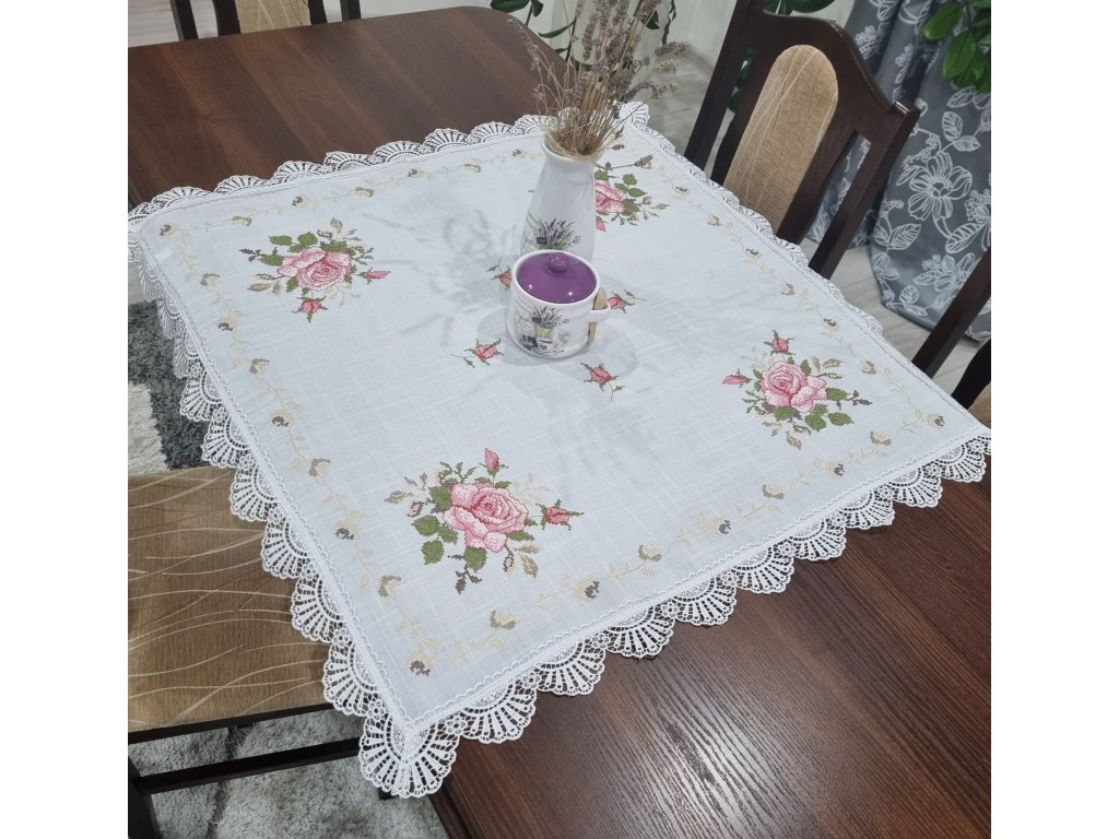 Dekoráčny obrus biely na stôl s bielou krajkou vyšívané ružové ruže.