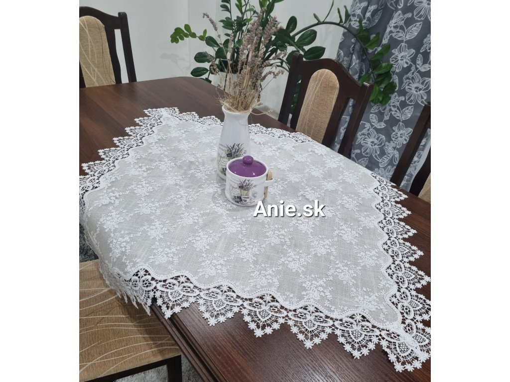 Dekoráčny obrus na stôl vyšívaný krémové hnede s bielou krajkou.